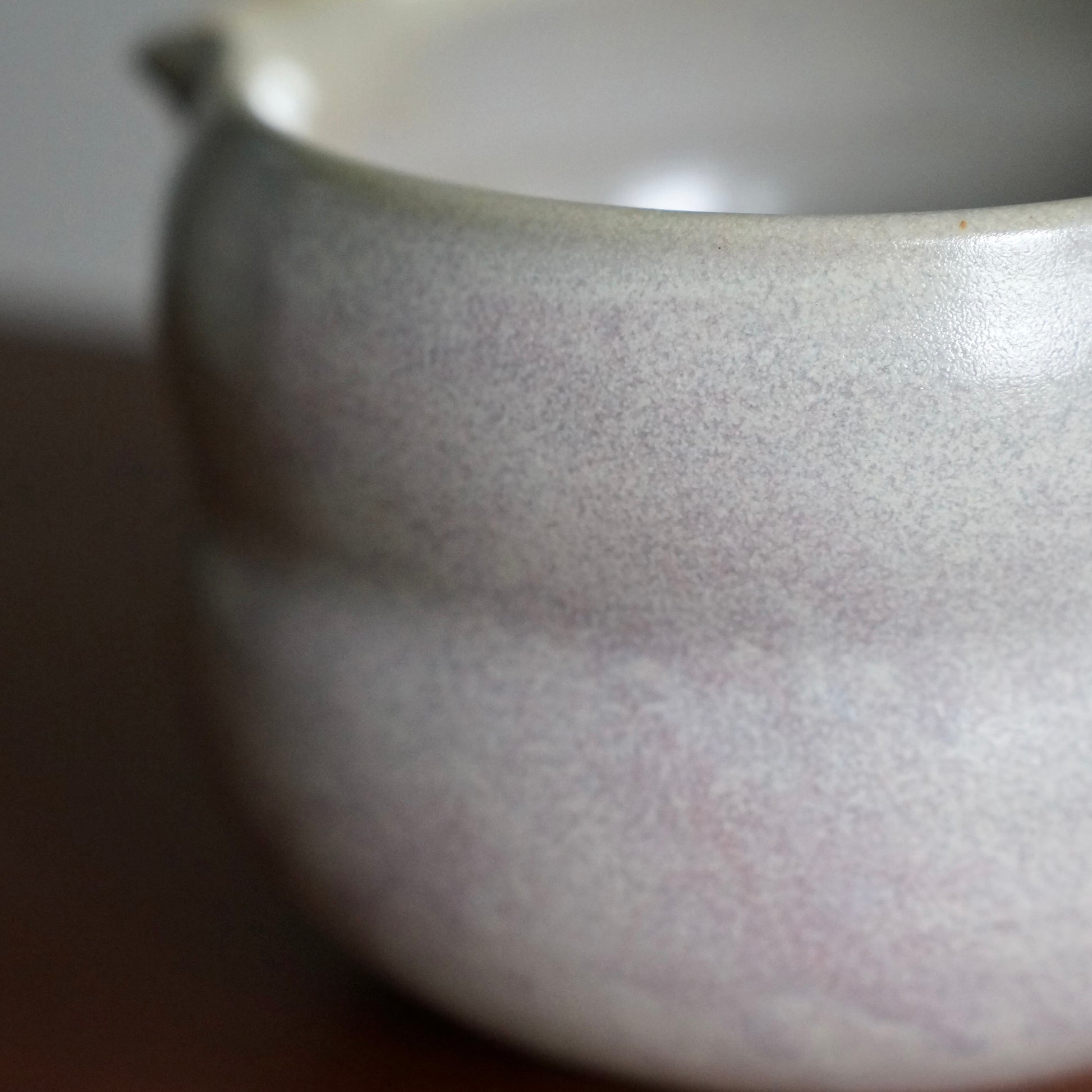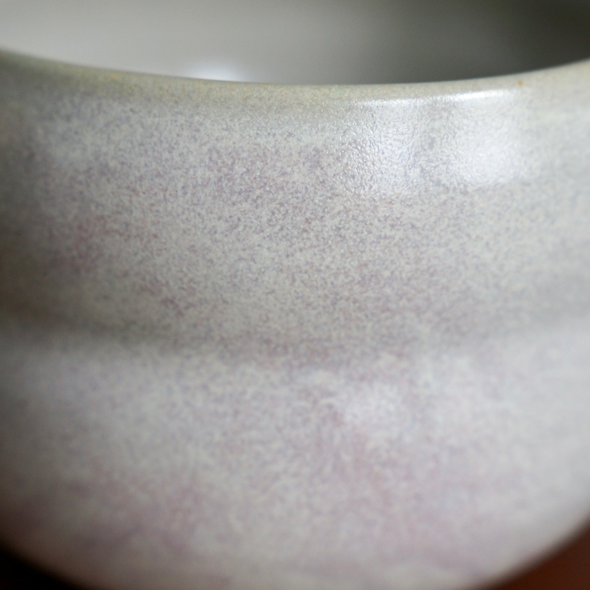 A matcha bowl with a subtle bubble shape. Subtle liliac hued speckled glaze with a slightly pearlescent finish.