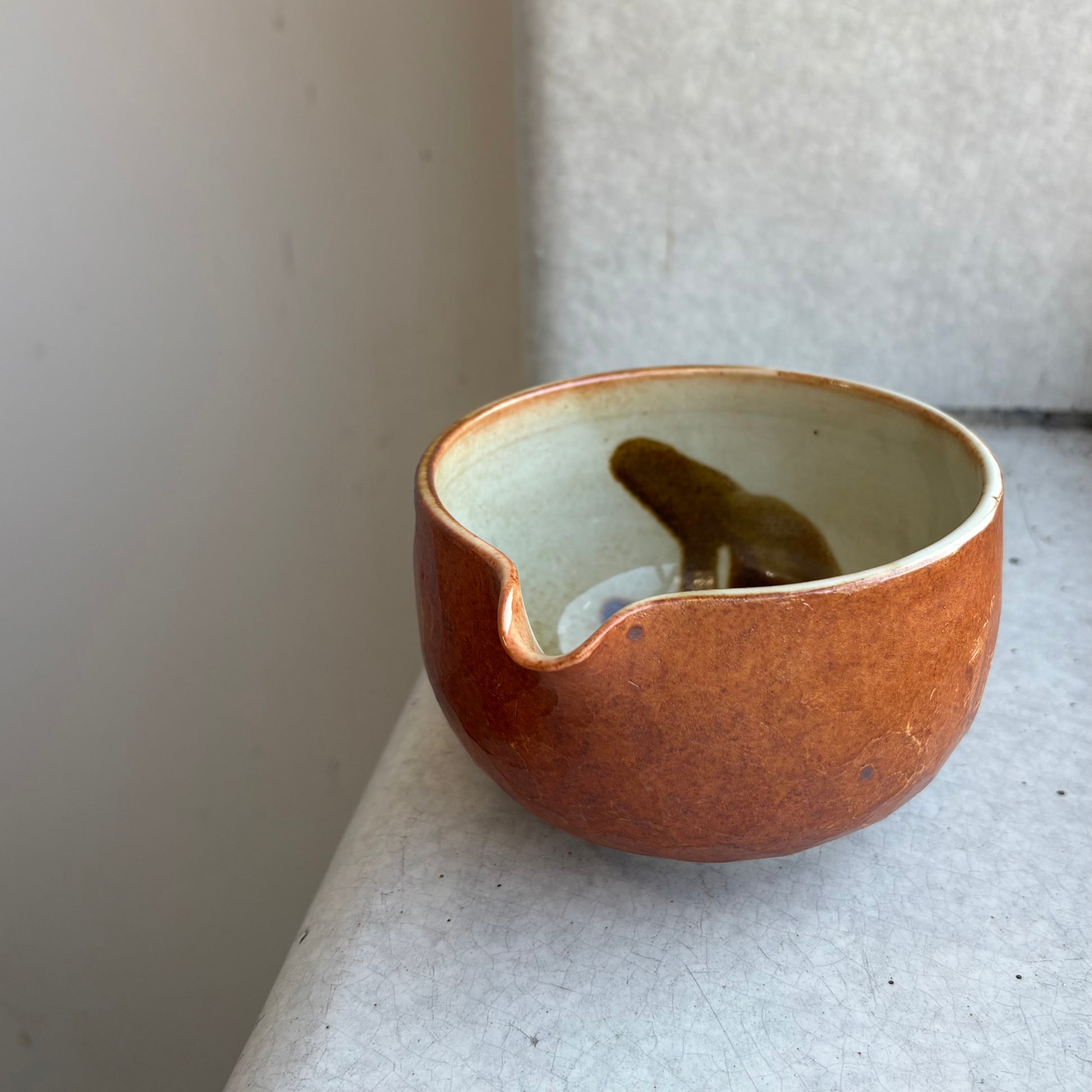 One of a kind experimental bowl. Hand carved facets on the exerior. Fired three times to achieve a metallic burnt coper on the outside. Inside glazed in a warm white with splashes/dusting of glossy brown.
