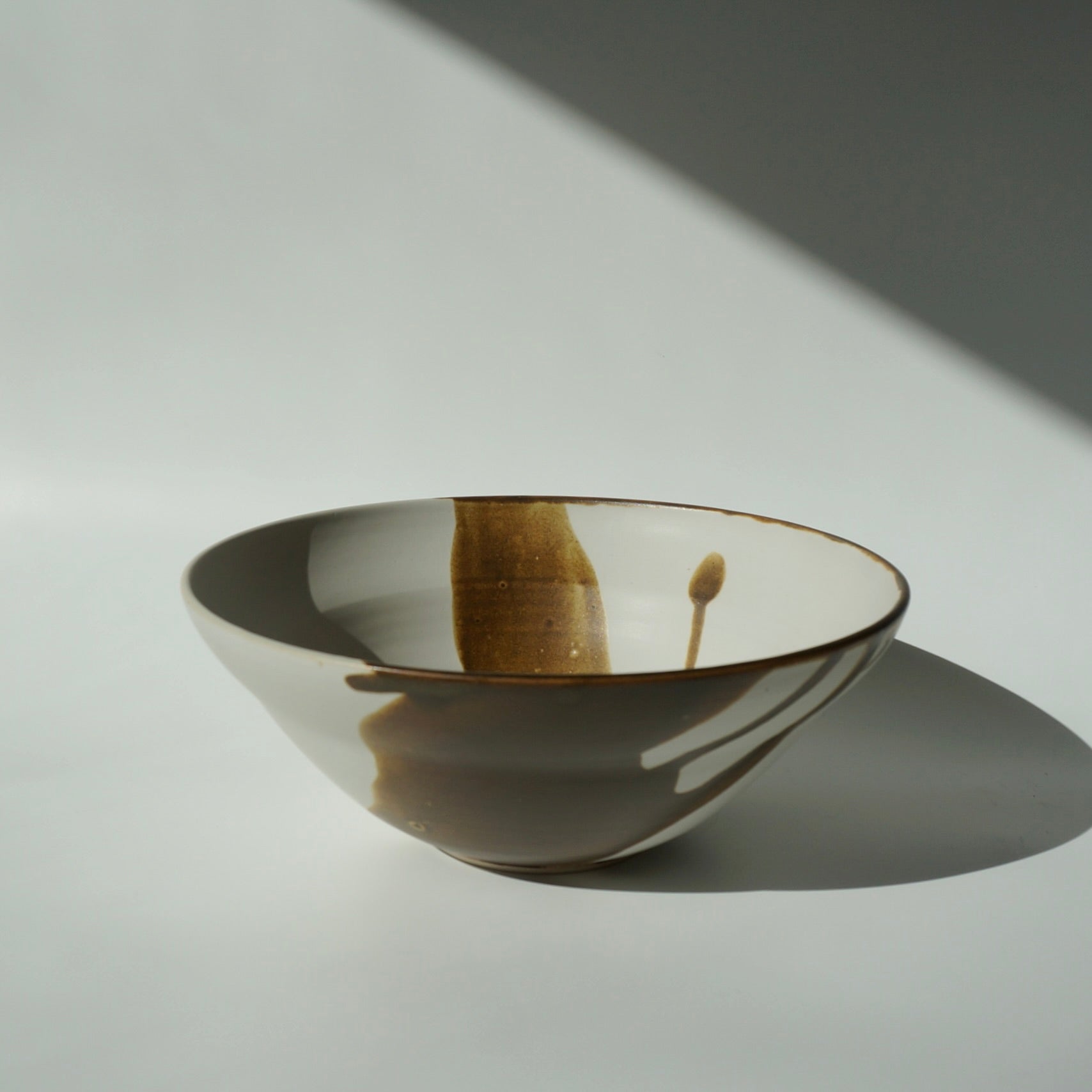 Glazed in a matte white with splashes of satin amber brown. Note that this is a different version of the regular glossy amber glaze.