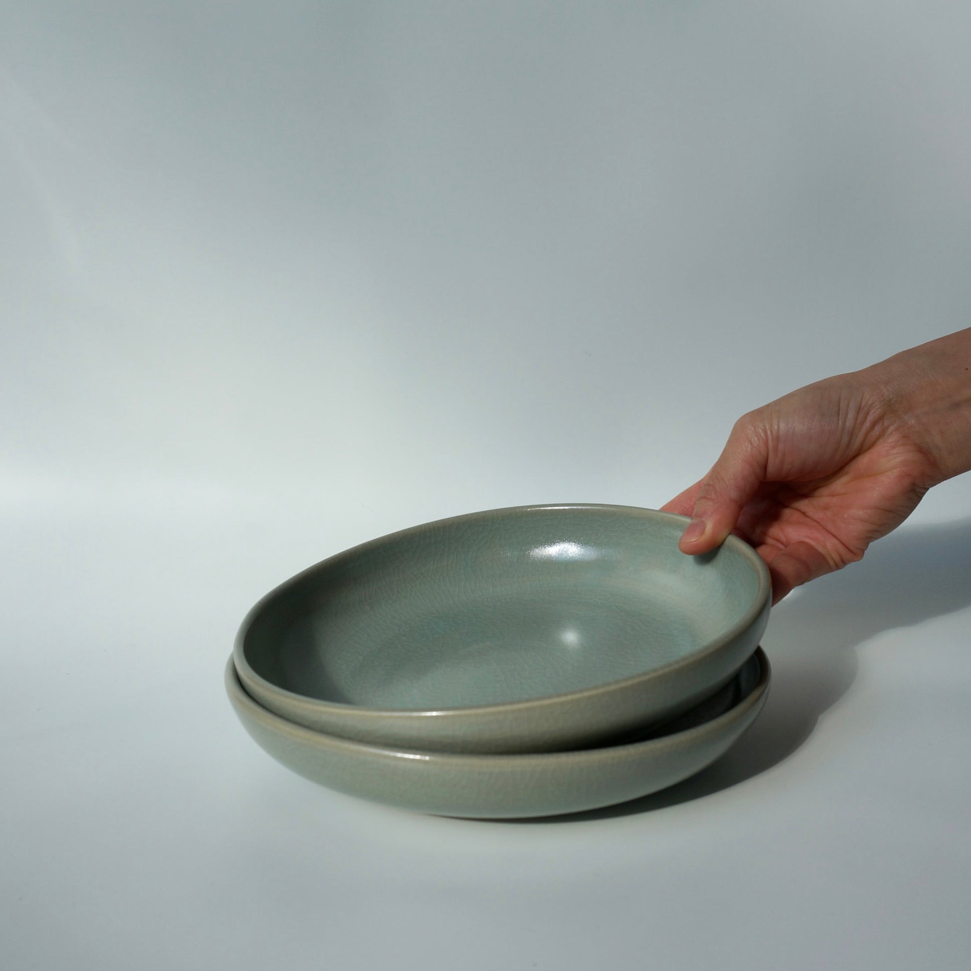 Dipped in a lustrous, crackled celadon glaze. This distinctive blue-green glaze is an ode to Korean celadons or "cheong-ja".