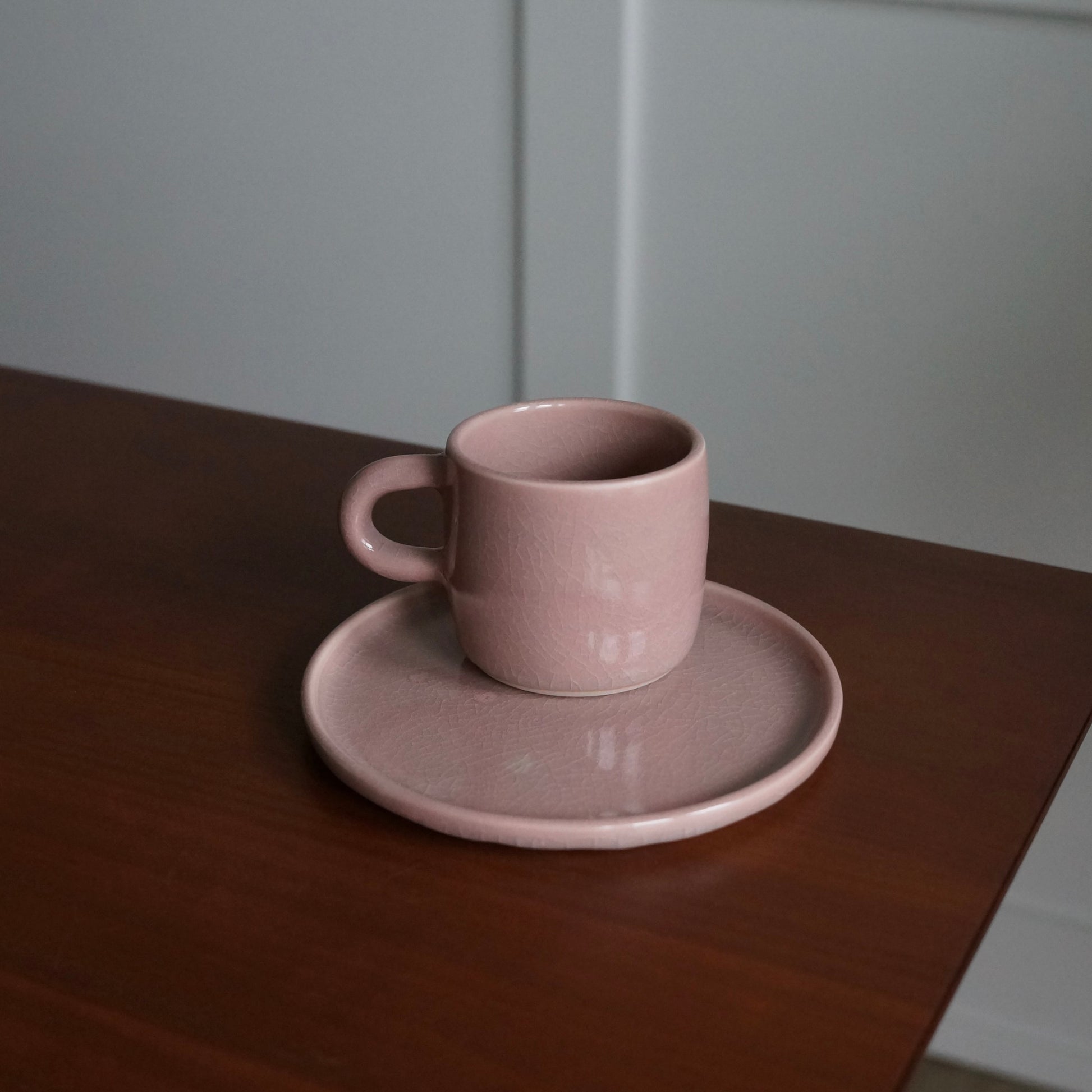 Small snack plate and matching handled cup. Perfect for a morning pastry and espresso, or an afternoon slice of cake and tea.